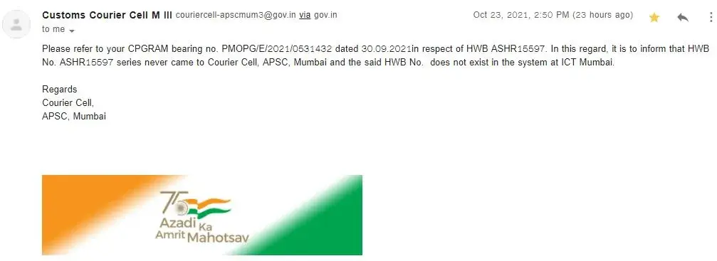 "Please refer to your CPGRAM bearing no. PMOPG/E/2021/0531432 dated 30.09.2021in respect of HWB ASHR15597. In this regard, it is to inform you that HWB No. ASHR15597 series never came to Courier Cell, APSC, Mumbai and the said HWB No. does not exist in the system at ICT Mumbai.