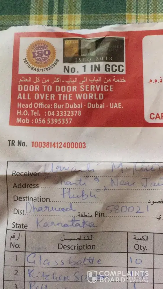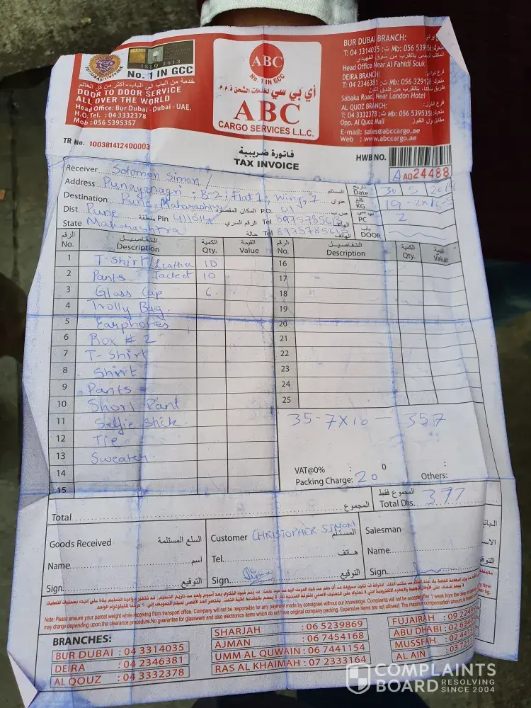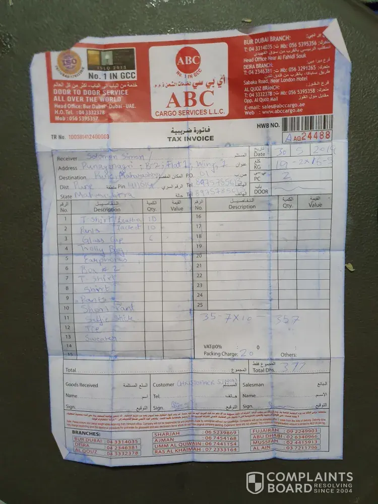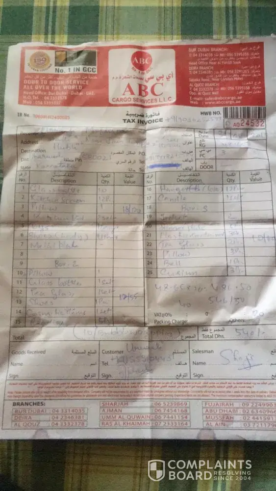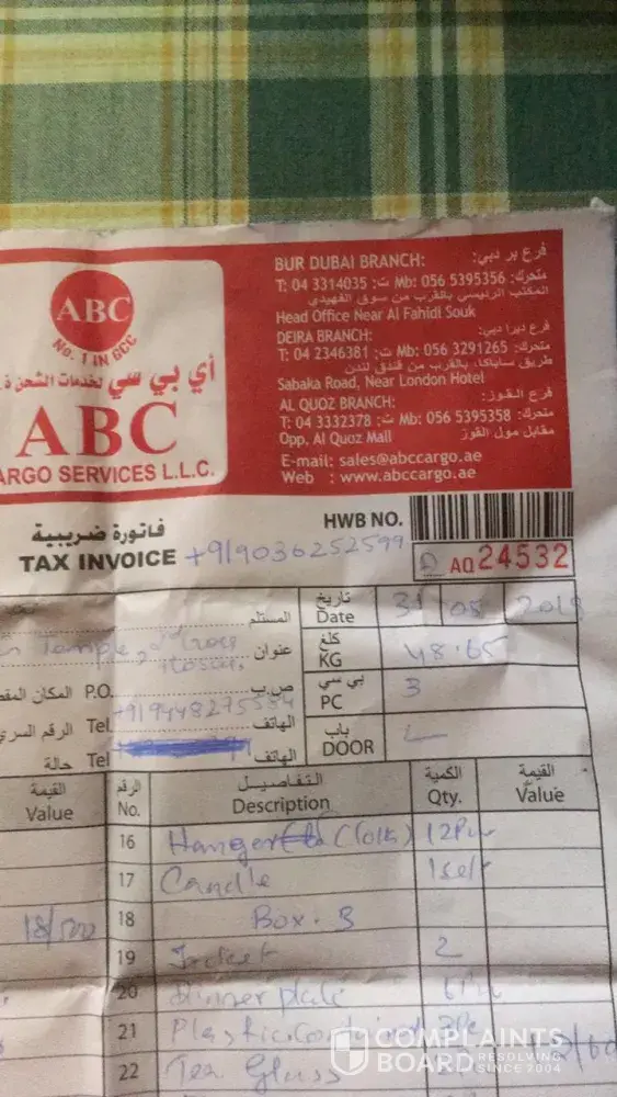 Number 1 : all the items sent from the UAE to India (Hyderabad) are broken, instead of Packing done by the ABC Cargo experts with an additional charges or separate packing charges are charged from the customer excluding the per weight charges.