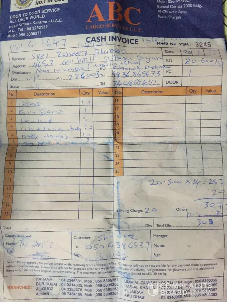 I'm Mohamed Kalifa.I'm send a parcel to my home (India) from Dubai.cargo full of food items.My Invoice No. is ABD2-2170 & ABD2-2171.There are tow parcel..i sent 02/07/2017 More than One month completed till now not reach in my house .Very poor response.Friends Don't send item to this cargo service