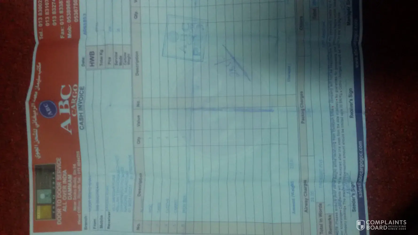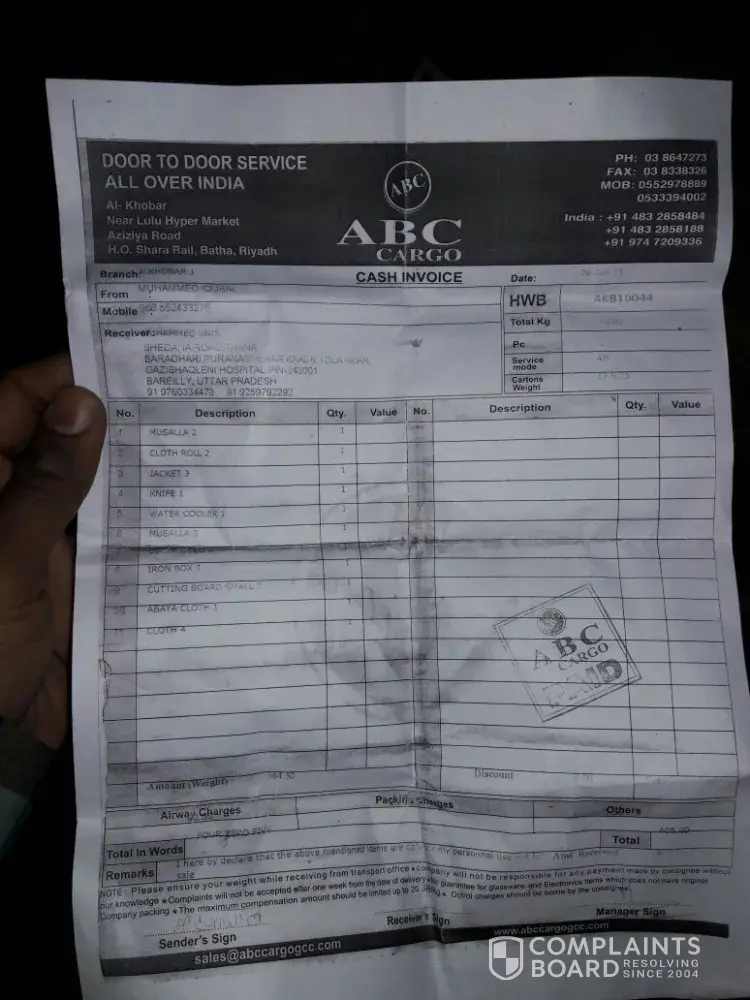 Sir my me send cargo by Abc cargo in Riyadh Saudi aarab shara rail baths date 24/08/2015 my bill no A256064 total kg 65.50 but no received in India Rajasthan so sir please solw my problems thanks
