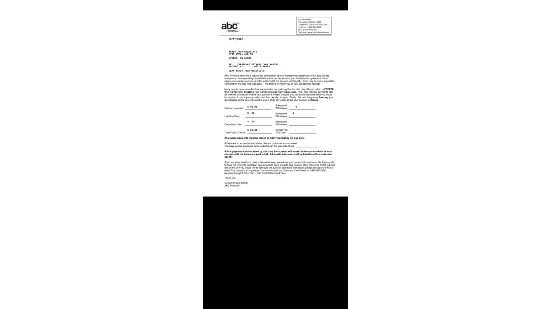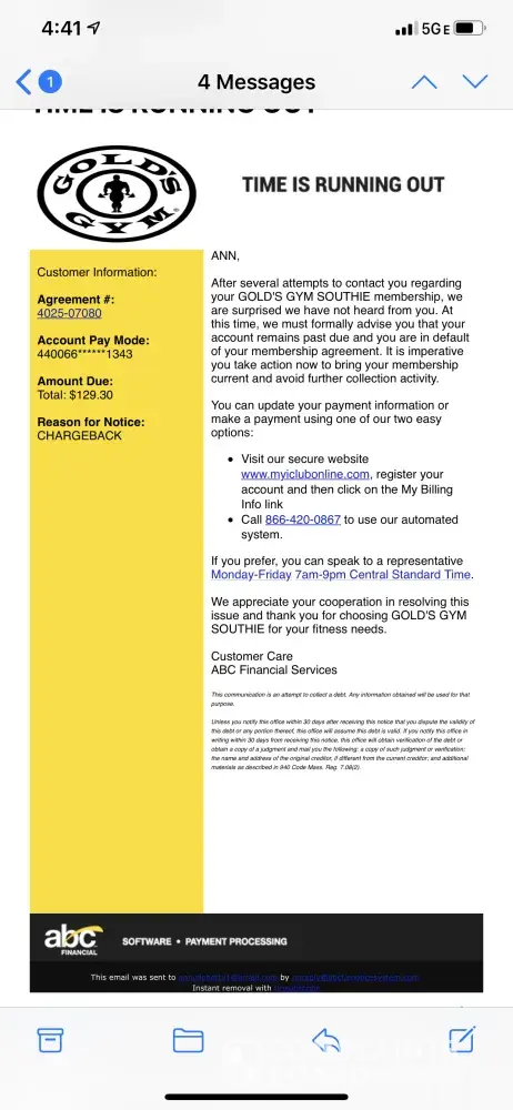 I then received an email from ABC financial stating that my membership was behind and needed to pay. I called them and explained to them what was going on. They are trying to tell me that when I called to cancel, that I really didn't cancel (or that was their understanding?). I said that's a bunch of crazy and went over all my texts, calls, etc. How would a sane person think that I didn't want to cancel when I called in to cancel in the first place?