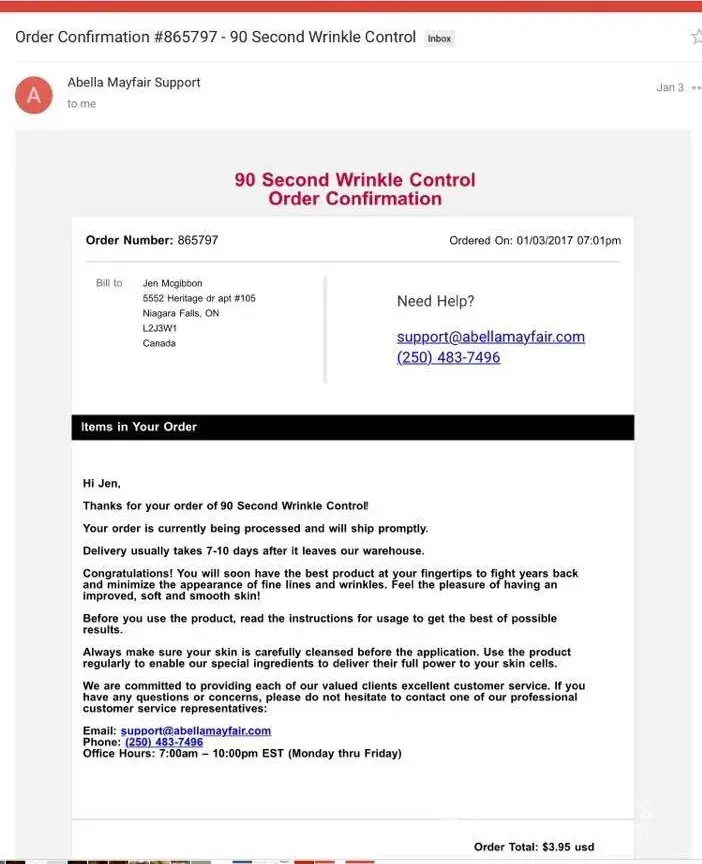 In Dec 2016 I signed up for a free trail of Abella Mayfair wrinkle cream, I thought for 4.95 S/H I would try it. The cream burnt my skin the first time I put it on, so I immediately stoped using it. I then started researching this cream and found out it is not FDA approved. I should have done my research prior to trying.