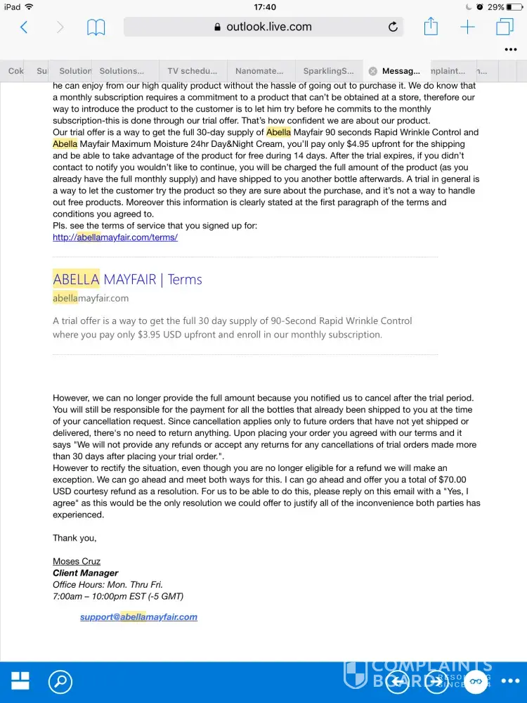 On November 13, 2016 i purchased a small tube of wrinkle cream online ($3.95 USD) from a Facebook ad for Abella Mayfair using my mobile device (cell phone). I was directed to an e-commerce site where no terms & conditions were given to me and no company website was visible. I never used any Abella Mayfair website to make this transaction and i definitely was not presented with any terms & conditions. I paid for the small tube of wrinkle cream and the transaction was ended immediately.