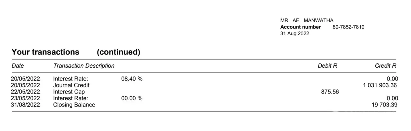 My bond was closed on the 20/05/2022 and I had zero amount owing, then on the 22/05/2022 there was a debit of R875,56 in my account, the bond closing amount is R1 031 903.36 and my refund is R19 703.39.