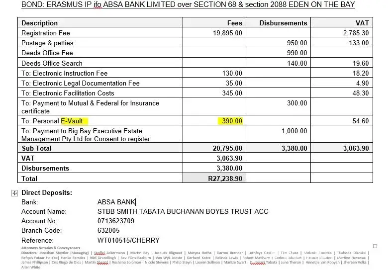 I would like to launch a complain against your appointed bond Conveyancing firm STBB. In two property transfers they are adding additional services to the accounts statements that is not required to increase their revenue which I think is not required. For example the opt me in for added services such as their E vault for R390 + vat just to view the documentation. This is utter nonsense and an obvious attempt to rip off the consumers and customers from ABSA. I also hold ABSA responsible as the consumer donot have a choice to which Conveyancing firm is used and ABSA should only contract firms with a competitive advantage to the customer. In this case ABSA is dictating terms and choosing suppliers which is by intent raising the bill knowing that the consumer has no choice. Its easy for ABSA as they are not to pay the bill and their customers end up paying an unrealistically ridiculous bill which add no value. There is also cases where I was double billed for certain items. I would like ABSA to take this up with STBB T: +[protected] and provide me with an update. Otherwise I will make an complaint at the consumer watchdog about unfair trade with both ABSA and STBB as target.