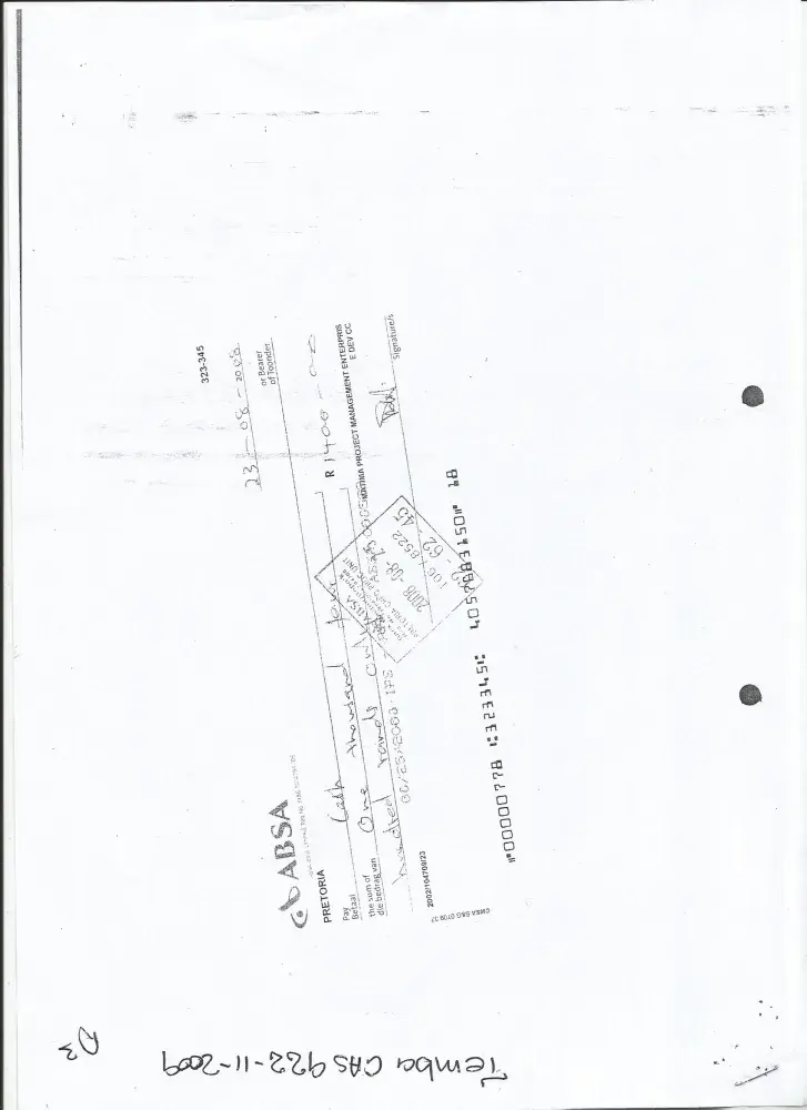 I am accused and criminally charged for been cashed a cheque number: ([protected] 323345 [protected] 18) of Matima Project Management Enterprise on the 25/08/2008. under case number 922/11/2009 of TEMBA SAPS.