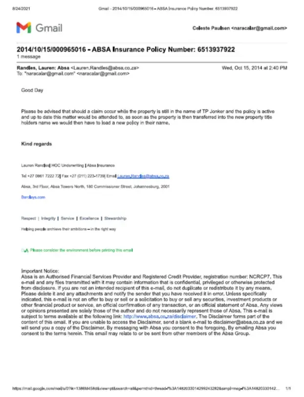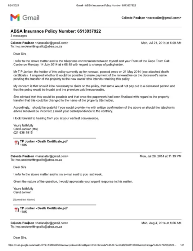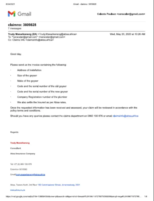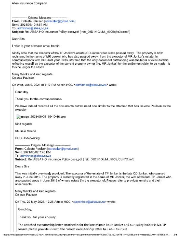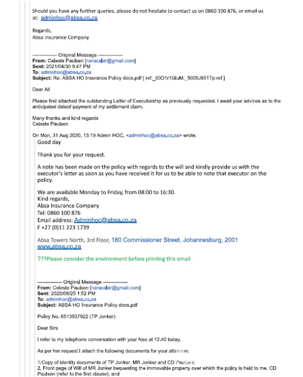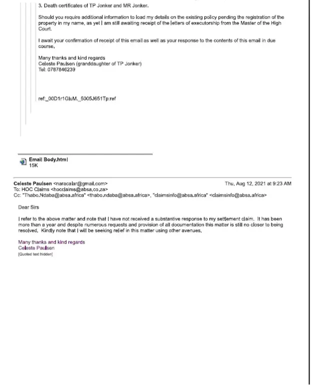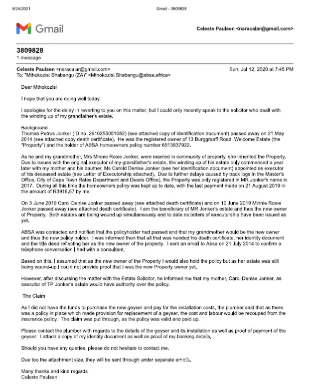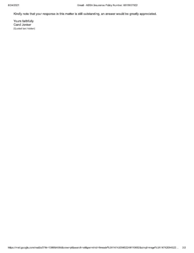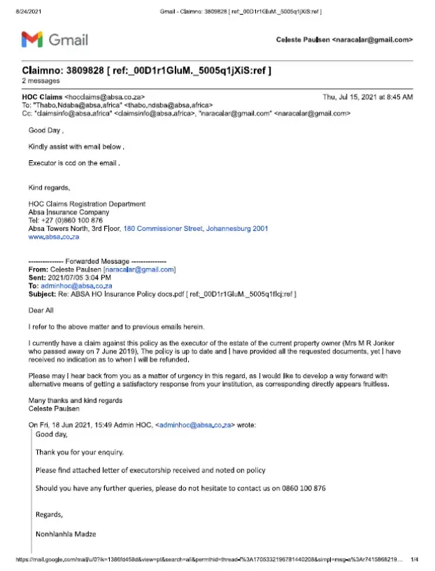 As I wished to keep the property insured, I kept the premiums up to date. A claim for a burst geyser was registered with HOC in 2020 (the first ever claim since the policy taken out). All outstanding documents were provided including the letter of executorship for my grandmother's estate which I was told was the only document outstanding.