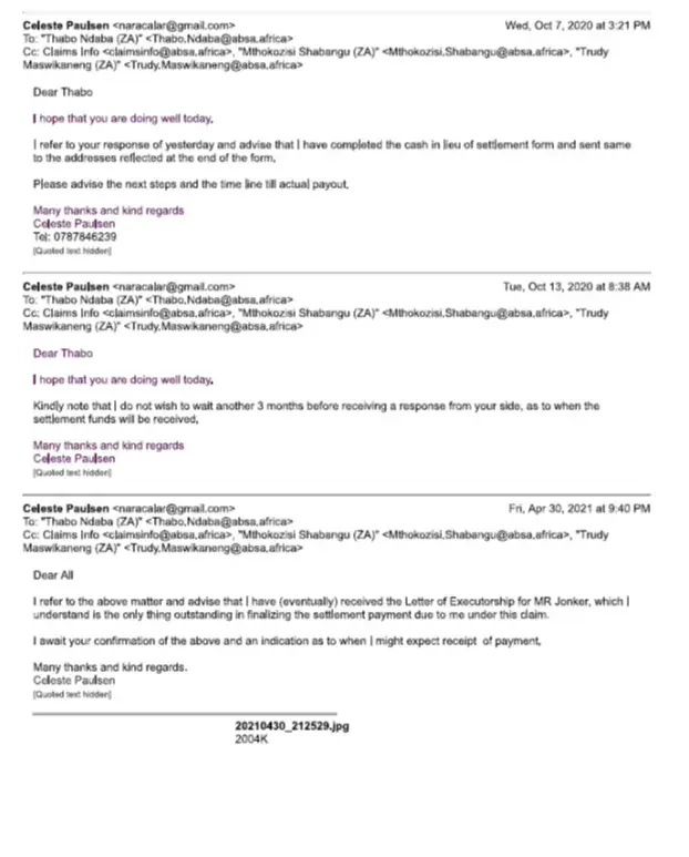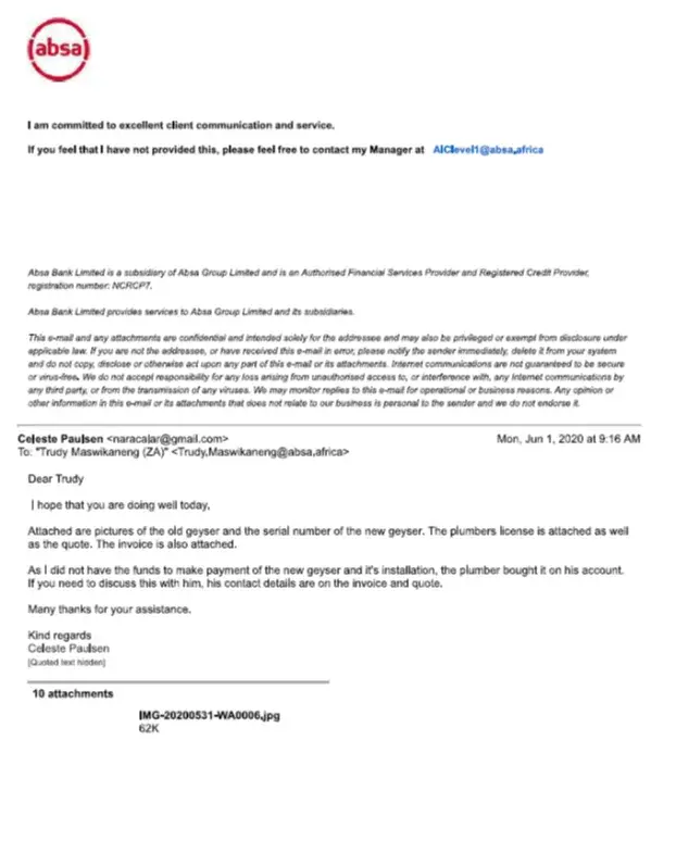 I emailed Absa setting out the story above and received a reply indicating that I should revisit the branch and ask the manageress to resolve the issue. This I did but detected resistance from her. I thought it was due to my attempt to bypass her system and she had taken offence. I felt that she was not going to co-operate in what can only be described as spite!