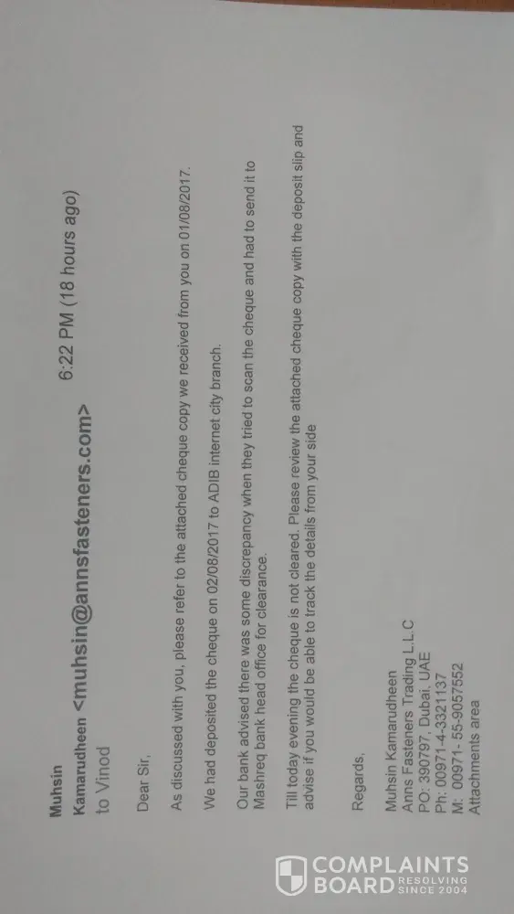 Till today the cheque is not credited to our account and I had requested the Branch to provide any documents saying the cheque has been send to Mashreq bank, so we could chase through our client.