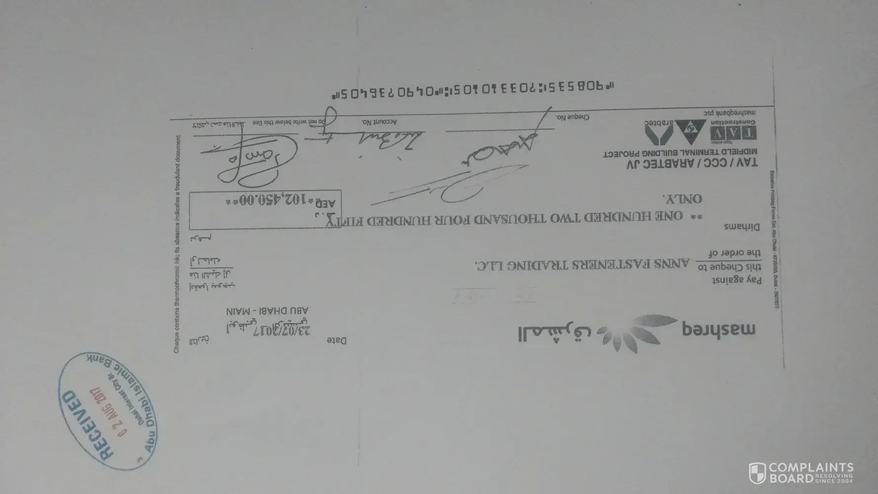 We had deposited a cheque Aed 102, 450.00 received from our client on 02/08/2017 at ADIB's Internet City branch, Dubai.