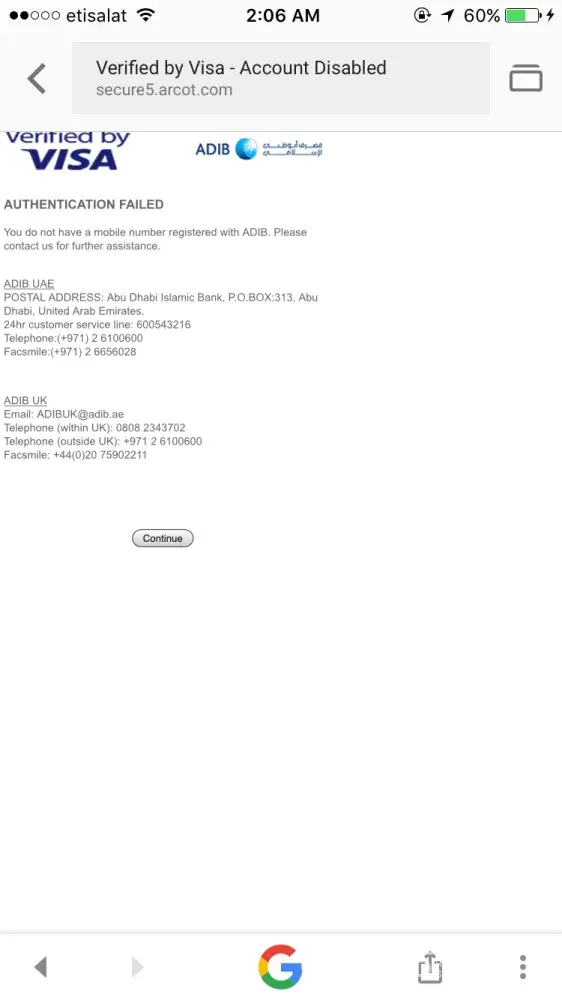 Authentication failed : you do not have a mobile number registered with adib, please contact us for further assistance.
