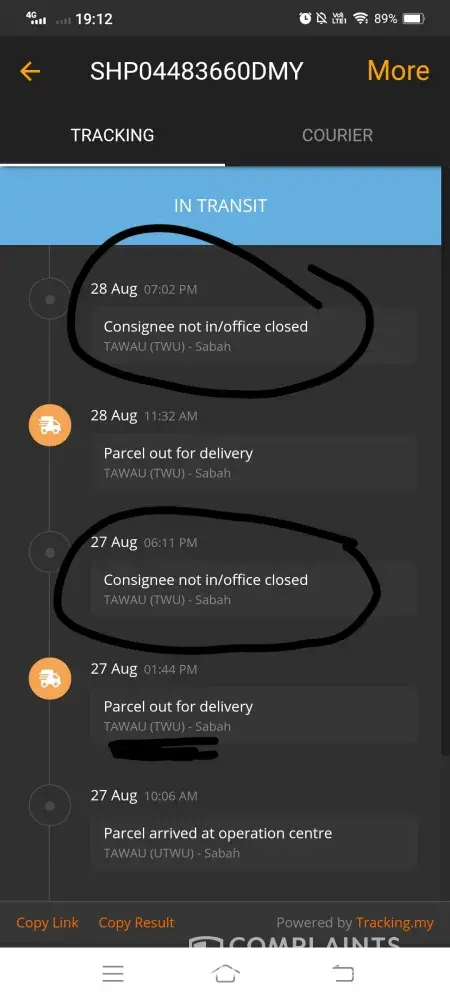 I haven't received my items yet. When I tried to track the item, I notice there are two times of delivery attempt but failed due to 'consignee not in/office closed'. Today I did call ABX semporna asking if my item is there with them or is it really at Tawau, but they assure me it's on the way to get delivered to my house in TAMAN PELANGI SEMPORNA. There was no any delivery attempt as I was at my house waiting for my parcel, but I got notified I wasnt at home so it didn't get delivered. I also noticed that it's got delivered at Tawau when it was supposed to deliver to Semporna? How can they make delivery attempt when I live at Semporna? Please settle this matter as soon as possible. I'm already tired of waiting, getting my hopes high just to get lied at and accused of not being home.