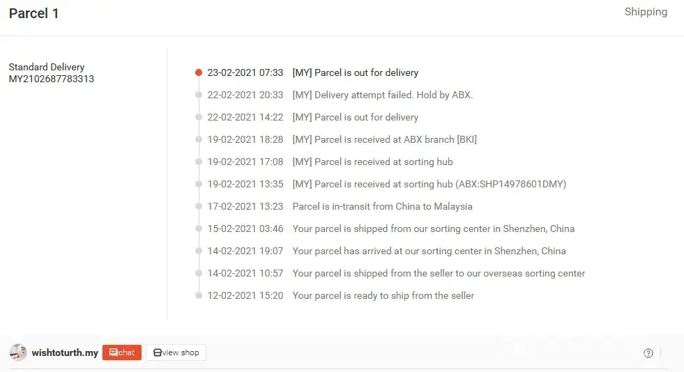 I have been tracking my package delivered by the courier company ABX (ABX:SHP14978601DMY). The package arrives to the city on the 19th Feb and the status was updated to "Parcel is out for delivery" on the 22nd Feb, I decided to stay at home and waited the whole day for it. No one came, heard no doorbell or driver honking, and suddenly the status was updated as "Delivery attempt failed. Hold by ABX". I know this was a lie. No one came or made any attempt to deliver the package. I reviewed the footage from the security camera and there was no sign of anyone from ABX came to the house. The next day on the 23rd Feb, the status was again updated to "Parcel is out for delivery". It's 7.30pm. Again, no deliveries came.