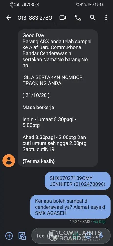 My address is "depan smk agaseh" why you send it to "cenderawasi" it's so far from my address. shx67027139cmy