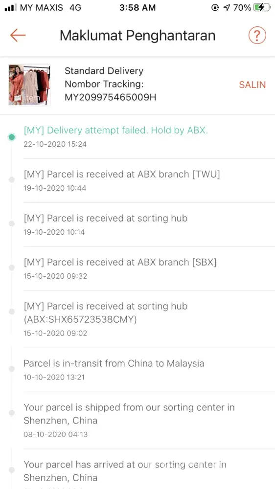 Hello. Hereby I attached my tracking update since 2/10/2020, which almost 1week my parcel still do not have any attempt to delivery to my address. Please update me as why the parcel stuck more than a week in warehouse and no delivery. This is the first time im having bad experience since using abx services. Shx52945183cmy