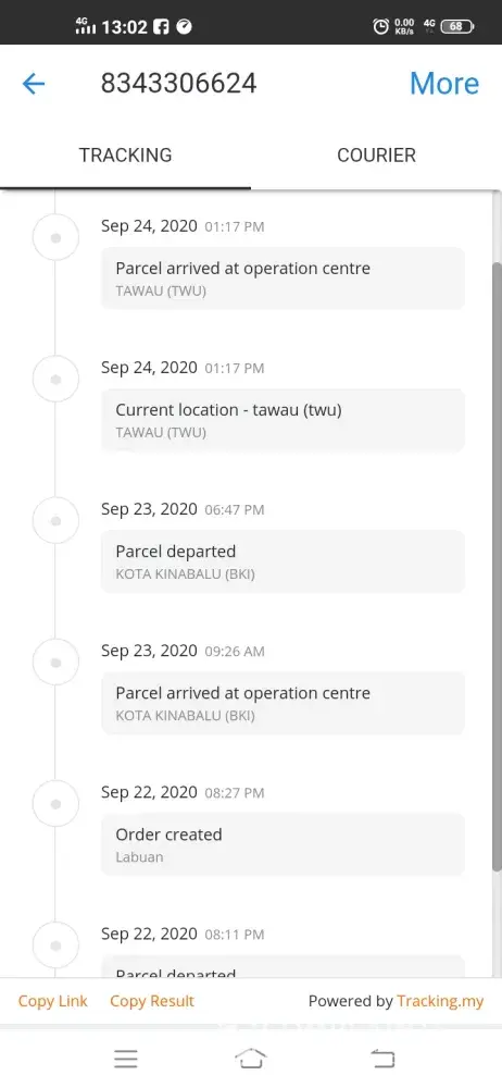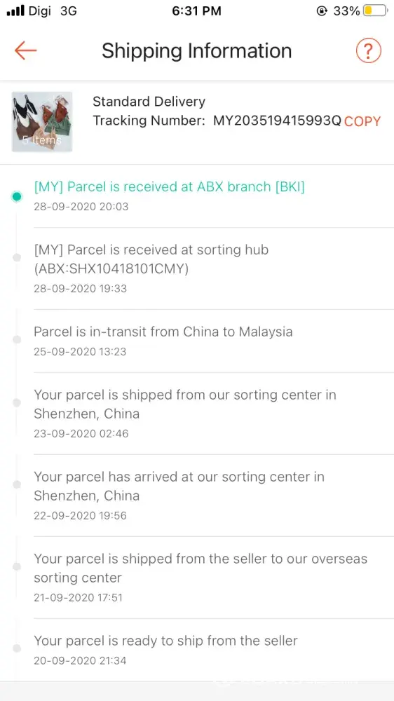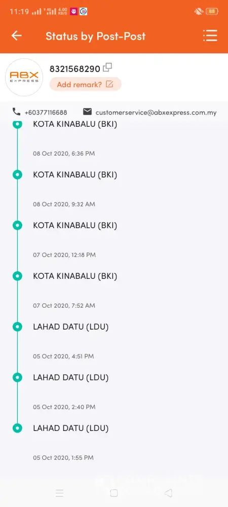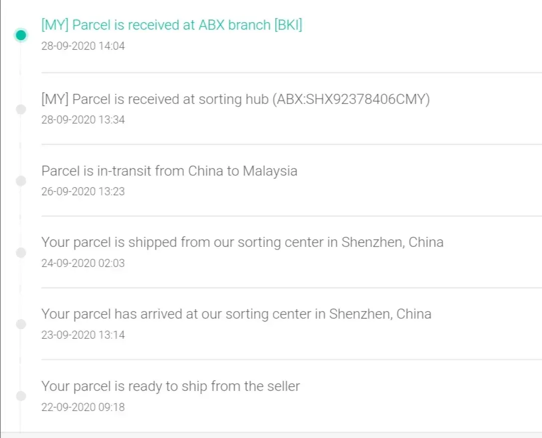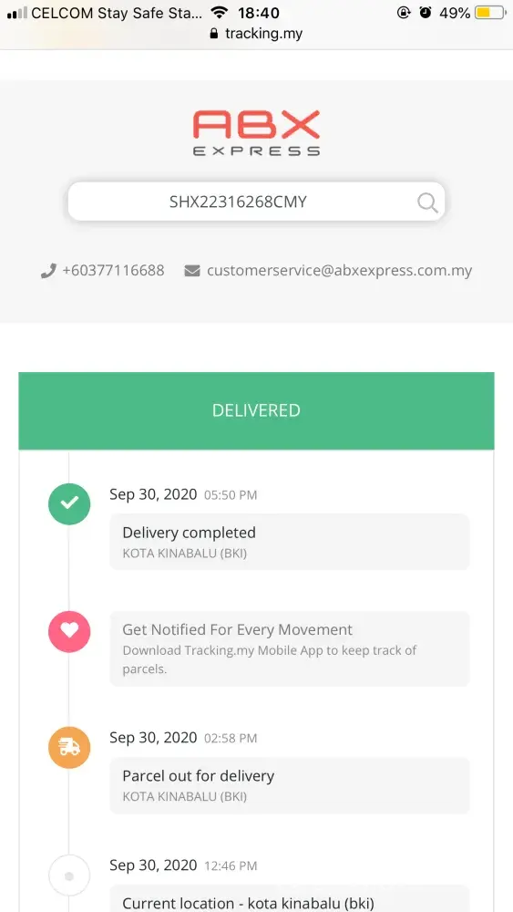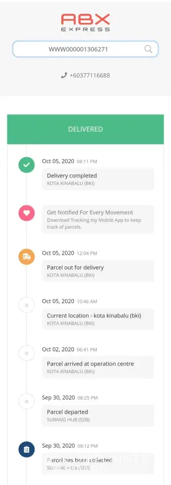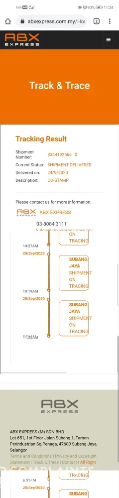 1.Barang sampai ke tawau 24/9/2020 dari labuan dan barang tersebut masi di tempat yang sama. Namun tiada pemberitahuan dari pihak abx sekiranya mempunyai masalah penghantaran.