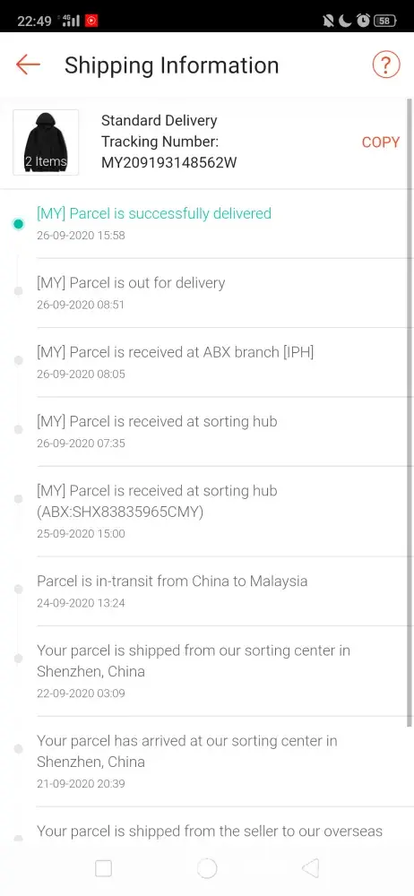 I did not receive my parcel (my209193148562w) eventhough in the tracker said it was delivered successfully to me. It was supposedly handed to me on 27/09/2020 by abx ipoh. But I did not receive anything and the fact that it said I already receive it, make me kind of dissappointed of the service.