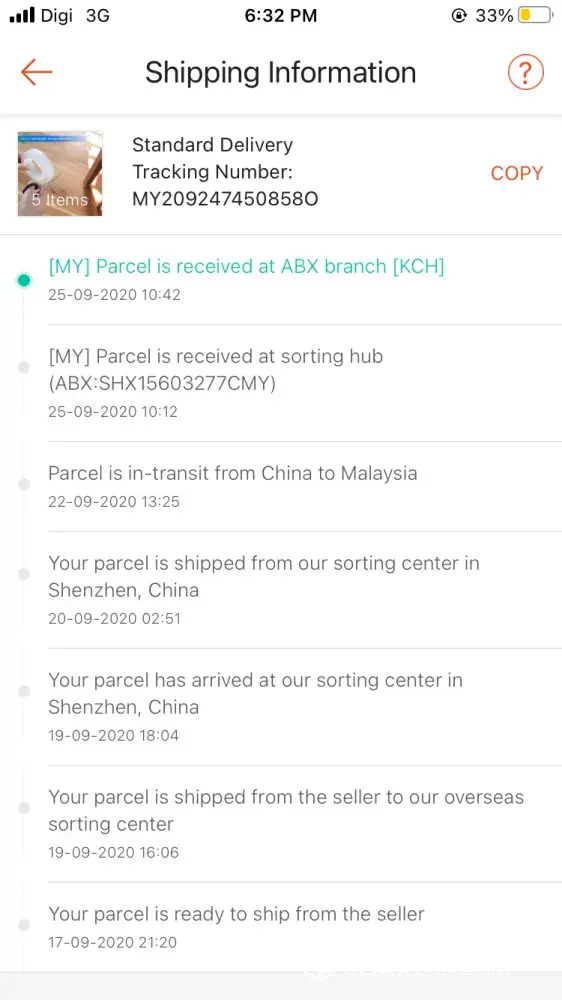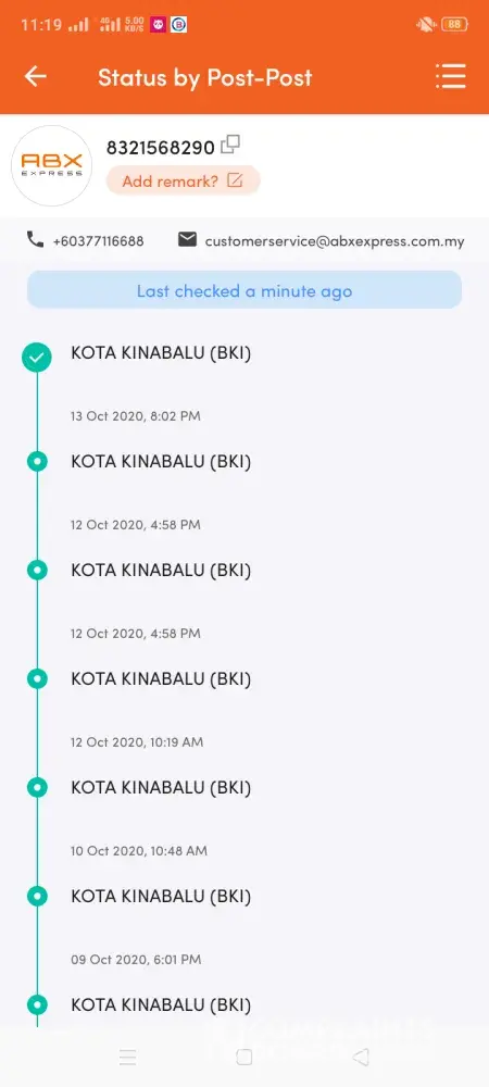 Saya nak bincang perkara yang sama, pihak abx tidak update barang sedangkan sudah berada di kuching..di sini saya lampirkan bukti.