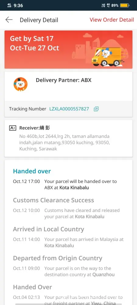 My parcel is at abx kuching centre since 07october2020.. please send my parcel ASAP
