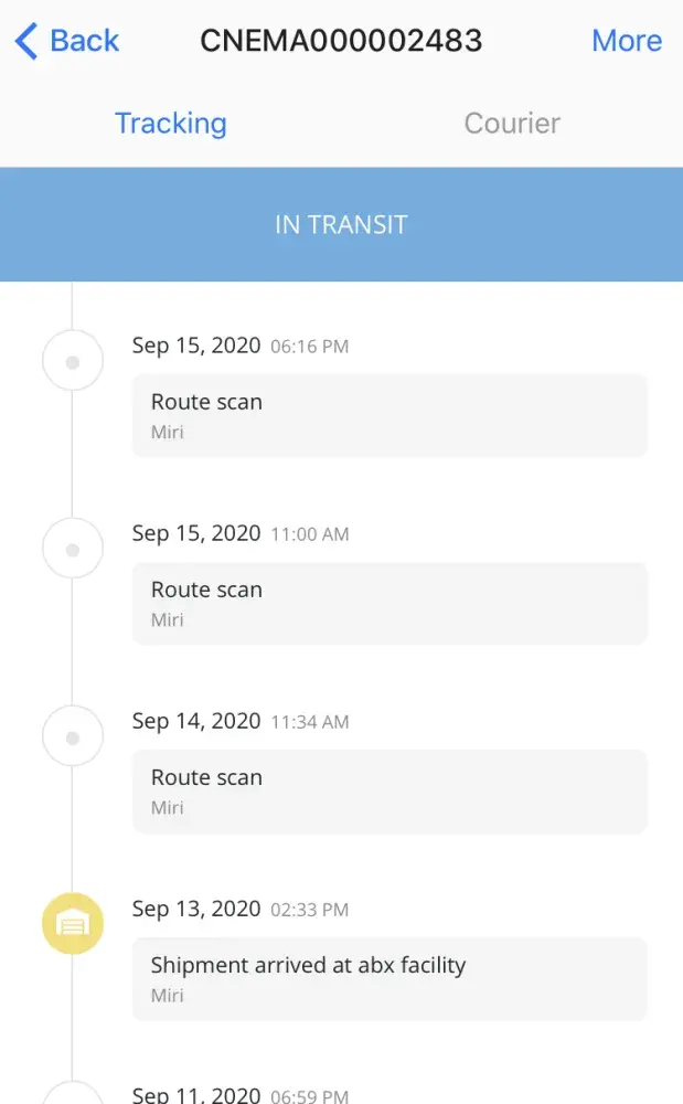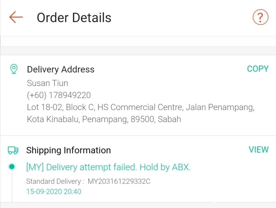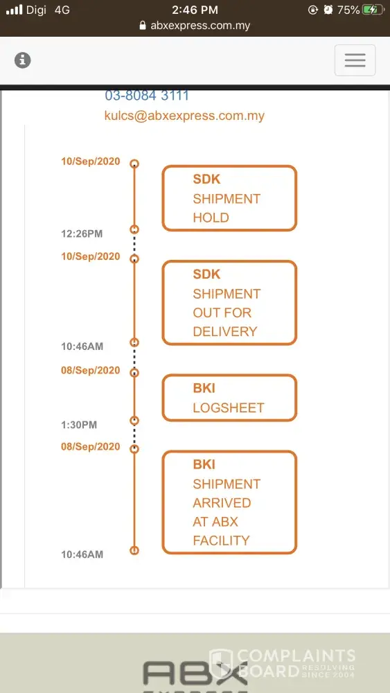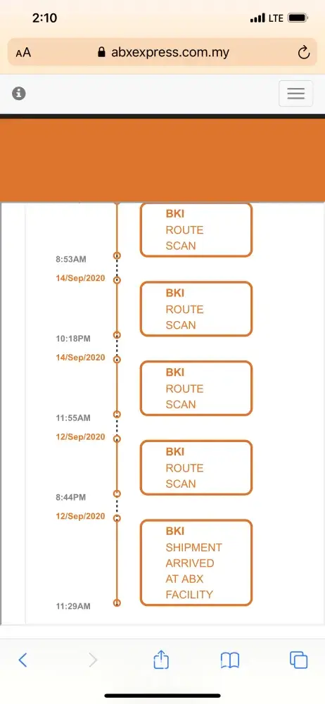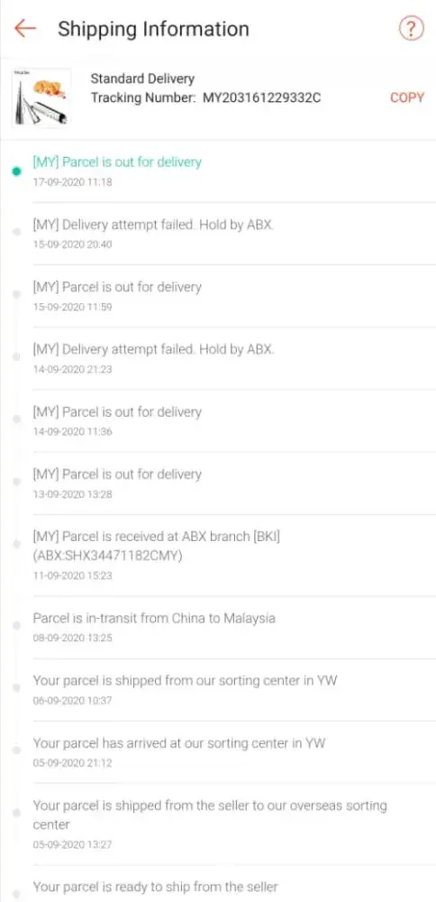 On 17/09/2020 called ABX about the parcel. The staff informed that they outsourced the delivery service which this runner is "normally" late in delivering parcels and always holding parcels for too long?!.