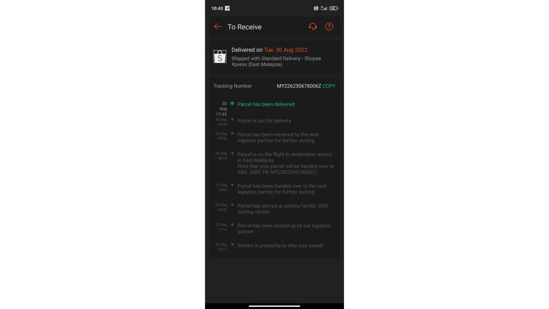 Hi, I would like to complain about my delayed parcel by ABX. My parcel has been arrived at sorting facility since 17.09.2022 and not delivered to my addresss up until now 20.09.2022. The item is from shopee and the courier stated is ABX but the given information about tracking number is invalid as I had checked the tracking number, is unavailable/invalid. The tracking number given is SHP63122693EMY. I HOPE THIS CAN BE SOLVE IMMEDIATELY AS I WAITING FOR A WGILE FOT THE ITEM TO BE DELIVERED.