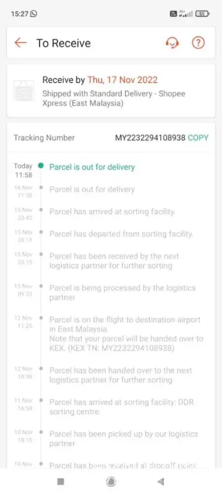 I want to complaint under order MY2232294108938, i bought thru shoppe and its seem that my order has been transfered to be delivered thru abx express. I tracked my order thru shoppe, and it's been 3 days, my parcel recorded as "out for delivery" but hasn't receive any parcel since 3 days ago, How did your courier do they work? Did they keep it as a treasure hunt or what? and today is already 18/11/2022, I tried to call your customer service but i can't reached out since it marks as Public Holiday, and i'm very sure your courier also enjoying they very precious holiday with a content heart without delivering customer's parcel. Well, this is not the first time I encountered this situation, especially from ABX Express. Please take proper action regarding this!