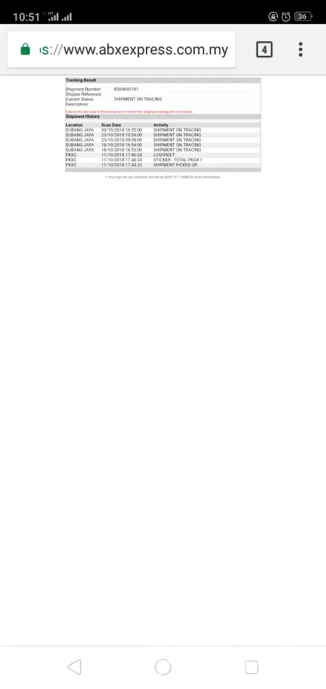 Hello, I should be receiving my parcel on 29th of November 2018, my tracking number is SHX05580133AMY. However, I received a chat from stranger saying that my parcel was in front of her aunt's house, she saw my number stated, so she chat me on WhatsApp. I was so confused at that time because I live in Kolombong, Inanam, but it's weird that the parcel was sent to Penampang, which is quite far from my place. Luckily, the person who chat me was kind enough to contact me and we met at a place so she can give me back my parcel. I don't want any refund because my parcel is looking fine as it should be, but my advice is please look more carefully when sending a parcel to someone's house. What if the parcel is something valuable and the one who shouldn't receive the parcel has the desire to take the parcel for himself? Anyway, this is not my first time using ABX. I've used ABX before and there's never anything like this happen. The service was always good and they always delivered my parcel right in front of my house. I hope the next time I use ABX, there would not be anything like this happen in the future. I knew it was not by accident so please pay more attention and check carefully on the address the next time. That's all from me, have a good day!