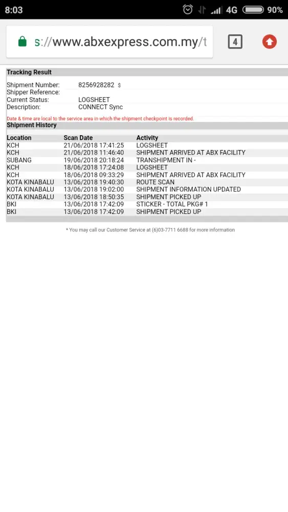 Barang telah sampai ke ABX Kota Kinabalu pada 26.07.2018. Sehingga sekarang 02.08.2018 barang tersebut masih belum di hantar ke sandakan. Silakan disemak no. Tracking SHX39823506AMY. Mohon penjelasan daripada company syarikat ini. Perkhidmatan ABX semakin lama semakin kurang memuaskan. Mohon perbaiki jika ingin perkhidmatan ini sentiasa digunakan oleh pengguna. Sekian terima kasih.