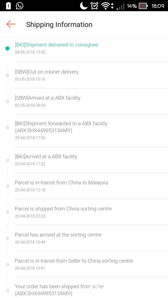 However, I still have not receive the item. On 25/4/2018, the item arrived at BKI. On 2/5/2018, the item has been arrived at SBW. Then, it should be arrive at Mukah for now. However, it goes back to BKI (KOTA KINABALU) and the status was 'delivered'. I feel so weird, why it goes back to BKI? I really hope that you can take action on this issue.