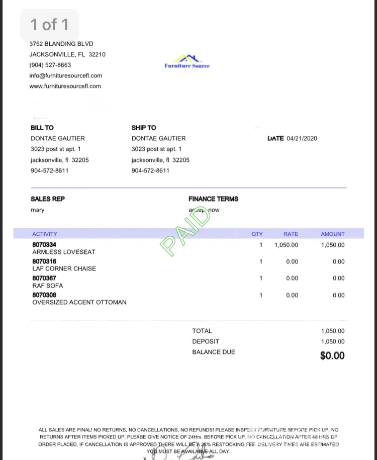 I went in to a furniture store in Jacksonville, Florida by the name of Furniture Sources and was told that I could finance and buy right out in three months. My partner and I used out entire stimulus checks to payoff the furniture. Two months later we continuous phone Morning and night sometimes we'll past 12AM. This company is fraudulent and absolutely...