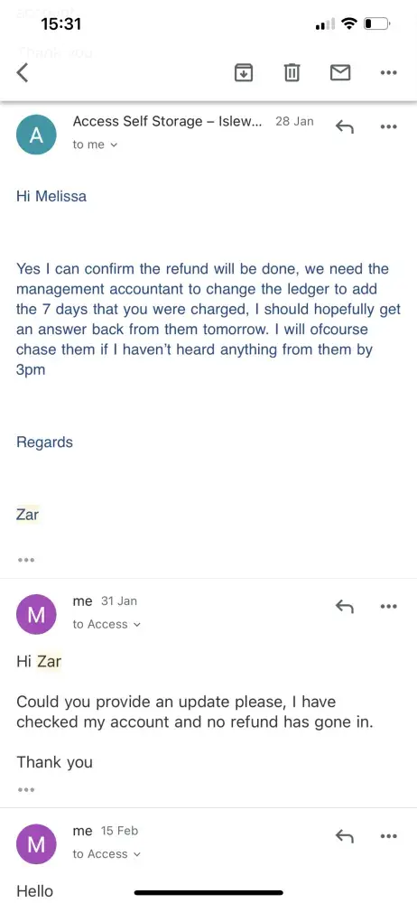 I was and am still due a refund from Isleworth access self storage and have numerous communication calls and emails from the management assuring me the refund will process. It's been going on a fe months now and I have had no refund or returned emails or calls in the last month . Please see screenshots attached at the various attempts.