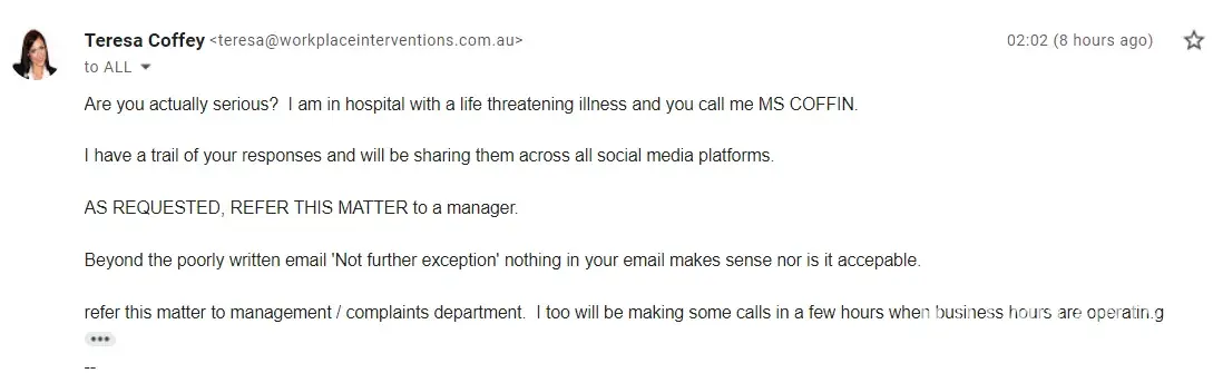 The email chain continues to ignore any of my complaint's or requests to escalate the matter, and I have ended up being on the end of hurful name calling. Given I am currently as I type this email in hospital from a life threating post op infection, the customer service person calls me Mrs Coffin.