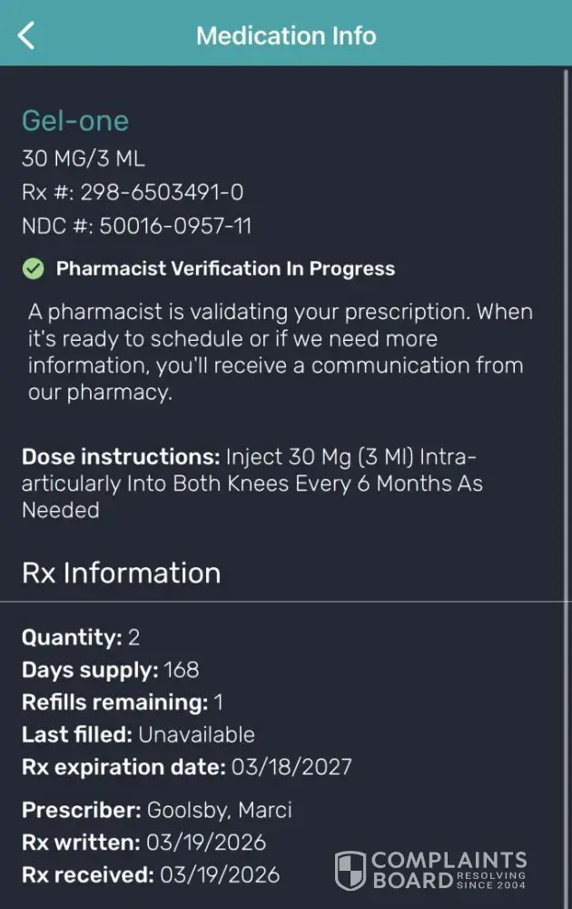My doctor's office has been contacting you since May 2, 2024. I have followed up three times at least . The doctor has complied with every request of information that your company needed. I had confirmation from them on June 21st and had confirmation with your reps that issues are all resolved and it has been processed and put in as a rush order. Now once again your company is playing games as why not to fill this prescription. This is ridiculous, this is an injection that is supposed to be shipped directly to Dr Potter. He injects the filler my knees for rheumatoid arthritis. I can hardly walk without my knees giving out...