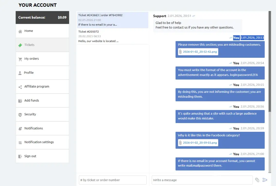 Another red flag is that, upon purchasing an account from Accs Market, you will practically never have any communication or assistance from their customer support. Even if a profile you buy malfunctions seconds after you make the purchase, you will hardly receive a refund or retrieval of your cash.