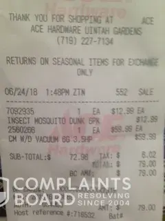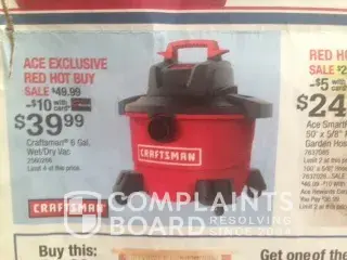 I received a sale ad for Ace Hardware last week, and on the front of the advertisement it says save now through July 9. In the ad there was a Craftsman 6 Gallon wet/dry vacuum for 39.99, however at the checkout it rang up for 59.99. When i asked the clerk about the price difference we looked and they did not have the flyer that I had received at home but I needed the vacuum and asked him "if I go home and get the flyer will you give me back the price difference." He said of course they would. Well I went home and got the flyer and returned to Ace with the flyer and the employee at the register told me that the ad was not good until next week. I told her that nowhere on the advertisement does it say it was no good until next week so she called the manager. The manager came and told me that the sale didn't begin until June 26, 2018 and I told me that he could not do anything about it. I had the ad with me and it clearly says right on the front SAVE NOW THROUGH JULY 9 and no where on the ad does it say that the prices are not valid until June 26th.