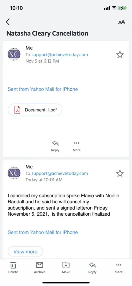 On Wednesday while watching one of Noelle Randall videos I hit a link to find out how I can start a Wholsale Through her coaching program. When I received a call I still assumed it was from Noelle Randall coaching, they were very respectful and I felt comfortable and joined. When getting the program I discovered it was not Noelle Randall but Achieve Today. I cancelled my subscription on Friday by a letter to support@achieve today and spoke with someone DONT want to mention names, and was told the subscription would be cancelled according to 3 day agreement. I contacted Monterey Financial though email on Friday and was told they haven’t received anything yet, I just need confirmation that the subscription is canceled