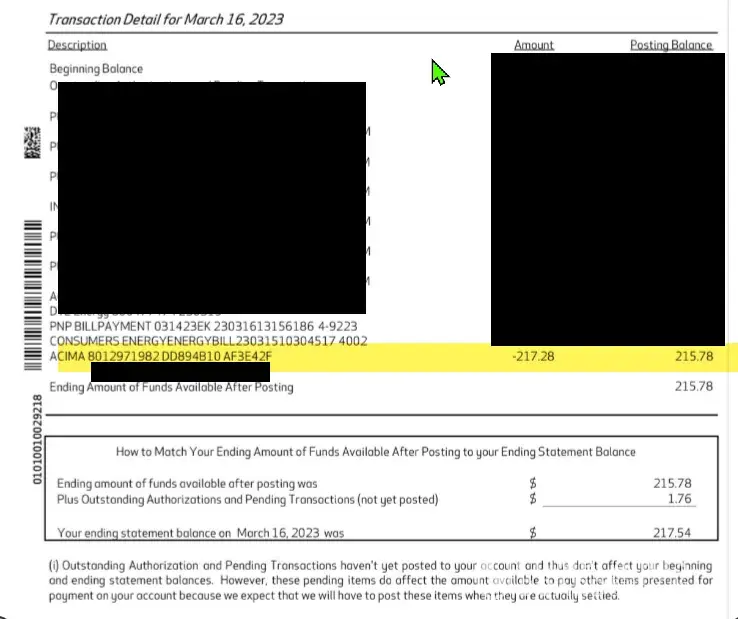 My was a victim of fraud. Someone charged $482.00 dollars on my checking account without authorization. I notified my bank to freeze the charge and called ACIMA of the transaction. I customer representative from the company logged in the complaint and informed me to file a fraud claim.