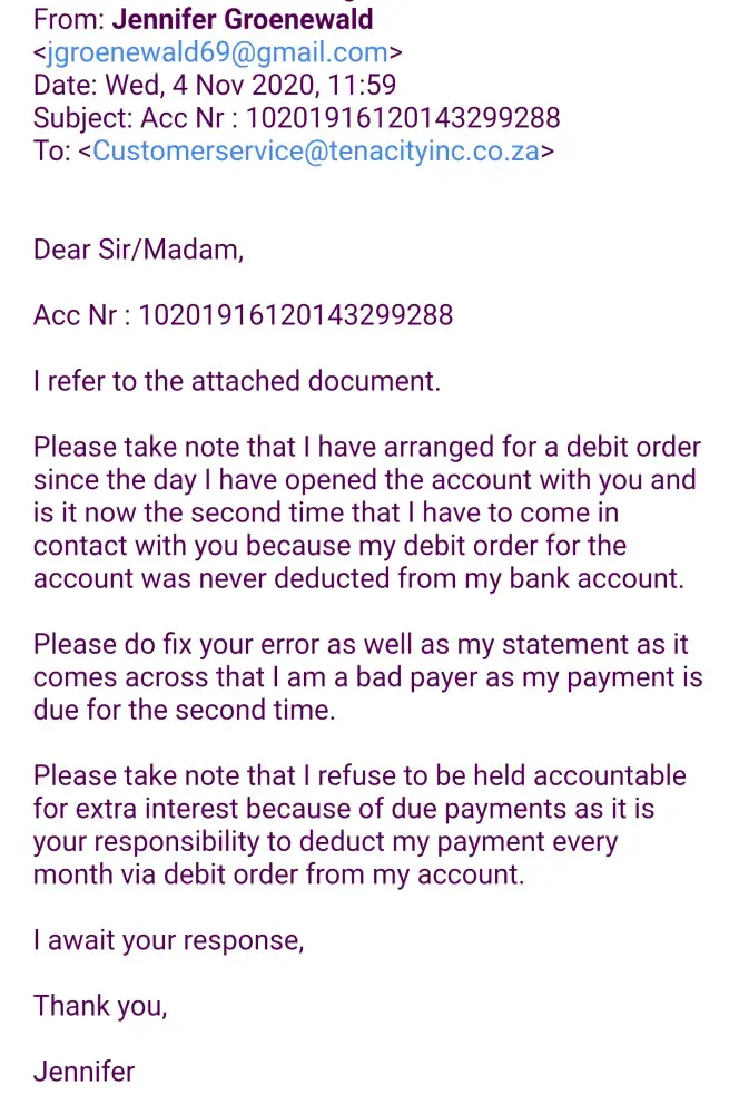 Arrangements was put in place payments was made and I am still being hassled about payment made on the 1st October that you did not receive. Proof of payment (EFT) time 8:45 am sent to you twice. Tried my utmost best to pay you even though I lost my job in January and still have the audacity to ask me how much and where am I getting the money from. I am very disappointed in the service we have received through this whole lock down and pandemic.