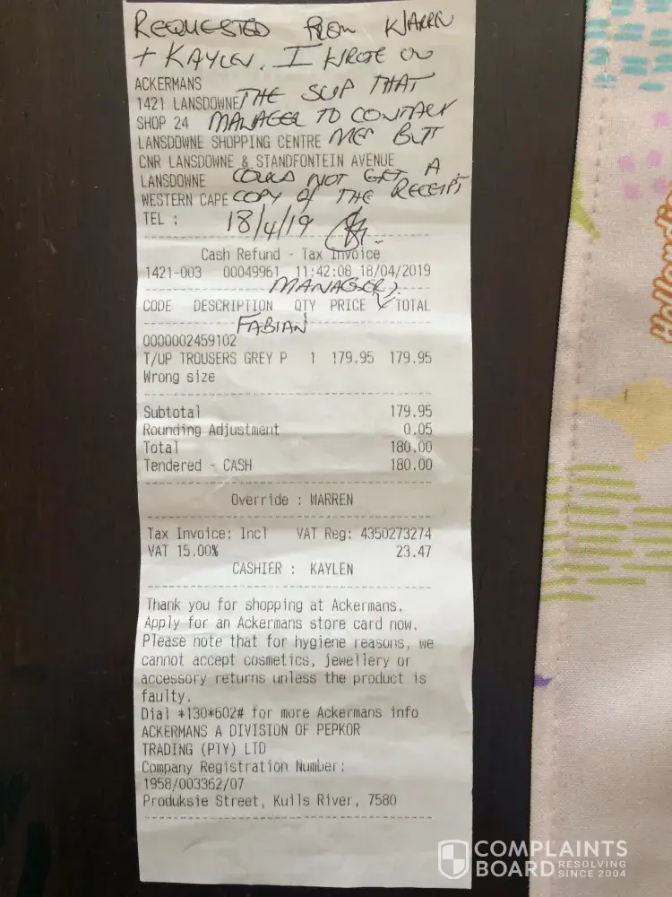 I said excuse me to Kaylen to ask if I could sign the receipt and get my cash as the pants was way to small for my son. Kaylen replied that I should wait until she's done on the telephone sorting out the client that came after me into the store. At this point Warren hear the commotion and screams from the door to Kaylen i must just wait till she is done on the phone. The client who's querying the account also start Verbally attacking me with Warren and Kaylen adding fuel to the fire. At this point I'm arguing with Ackerman's staff and being Physically assaulted by Ackerman's client. Please take this matter as a serious complaint as I have laid criminal charges at Landsdowne Police station. My name is Salama Nusterdien I'm diagnosed with Anxiety and Depression and due to this incident has been undergoing treatment by my Doctor Imthiaz Hoosen. Thank you