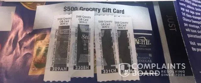 I won a 500 grocery card on monopoly and called my store to ensure where to send board they said send to address on game. I did.
