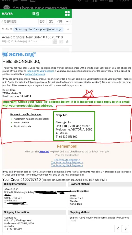 Hi. My name is Seongje. I am from Korea. I am writing this to disclose what Acne.org did. I have been using their products since 2012 when I was in Melbourne, Australia. A few days ago, I bought some products and I realized by the confirmation email that the shipping address was wrong. I don’t live in Melbourne anymore. I live in Seoul now but it said it would be shipped to Melbourne. At first, I thought it was my mistake but it turned out it was not. The evidence is that when I set my shipping address as the one in Melbourne, it is 120.61 dollars but the one in Seoul, 117.20 dollars. (Please check out the pictures I attached, picture 1 for Melbourne and picture 2 for Seoul, you will see each shipping cost) After I paid, I got a message saying that 117.20 dollars has been paid (picture3), which means I correctly chose the shipping address as the one in Seoul. However, they insisted that it was my fault based on their system (picture4) and they said they would not refund for that. But how could I possibly know about the system? And if I had known about the system, why wouldn’t I have changed it? Let’s say it was my mistake (it was not my mistake though) A ridiculous thing is that I got a mail saying that “if the shipping address is incorrect, reply to us†(picture5), so I responded with the correct address right after I paid and checked out the mail. However, next day, all I heard from them was they already sent the products out to Melbourne and I needed to pay for the shipping cost. If they never check out my email, why would they send me such an email? I explained the situation to them via email but they told me to answer their call to talk about the problem. Do they not know it charges me to receive an international call? And what was worse, they called me at night two times. They even don’t know the time difference. Thankfully, my friend living in LA called them instead of me but they said that only when I let them know the products arrive in Melbourne, could I get the refund only for the products. I tracked the record but I found out something shocking. For the last 6 days we were talking on email, what I ordered was still in San Francisco(picture 6), which means they even didn’t try to take it back and just let it go to Australia. It is so inefficient and they are so IRRESPONSIBLE. Now, I already gave up the shipping cost and I am trying to get back the money for the products. I am not writing this hoping you help me or I could get the full refund. I just want everyone to know what they did to someone like me so called a regular customer who has been using their products for almost 3 years. I think they are so beyond common sense because they are in pursuit of the small benefit not knowing that they lose a customer who could bring them larger revenue in the future. What do you think?