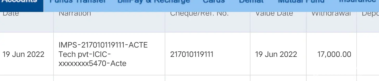 I have paid 22000rs to Acte Institute Velachary Chennai. [protected] coordinator and sales Representative +[protected]