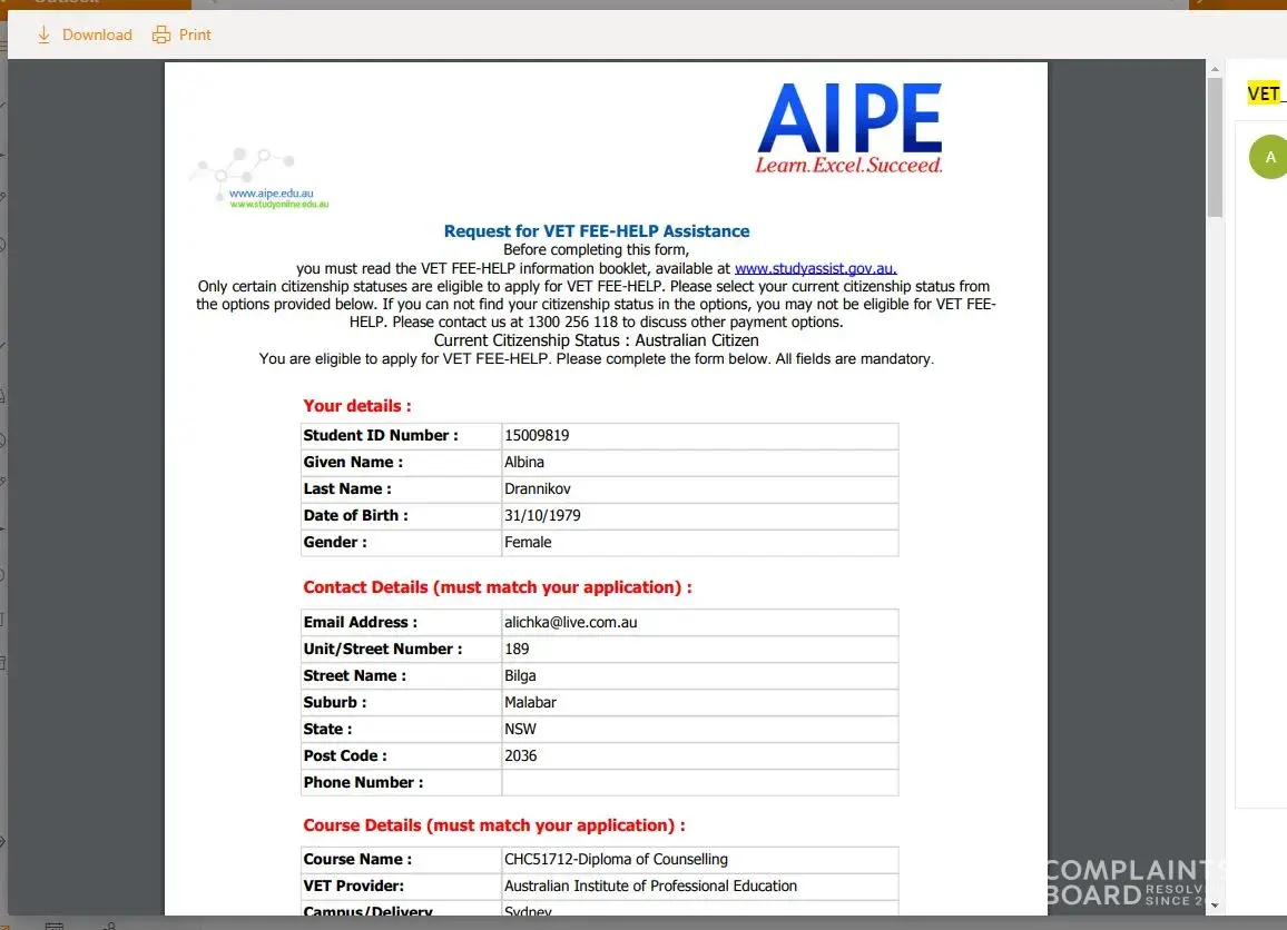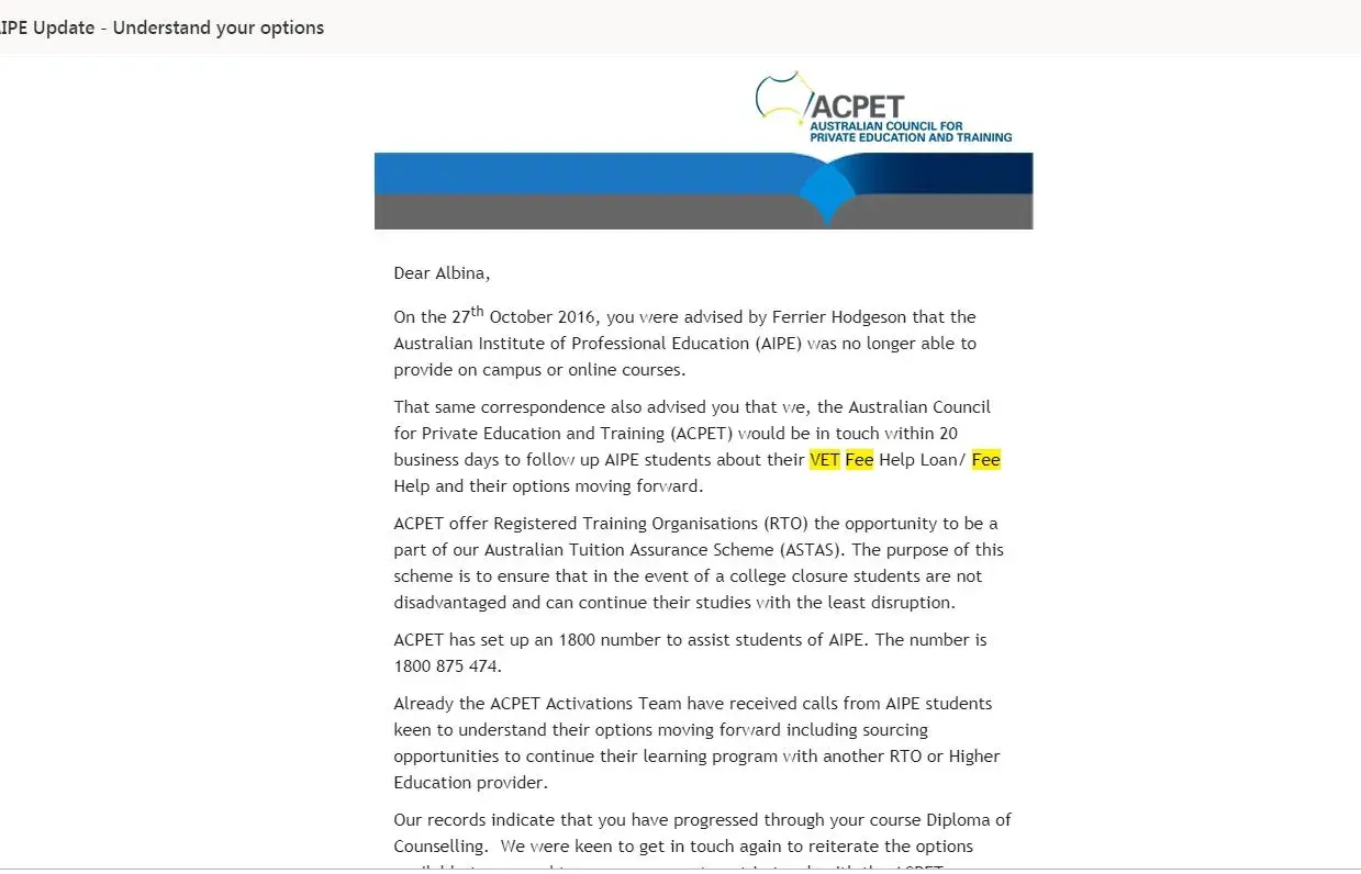 I have not even started the course and the institution went into liquidation. They still charged me $19K in VET fees connected to my TAX