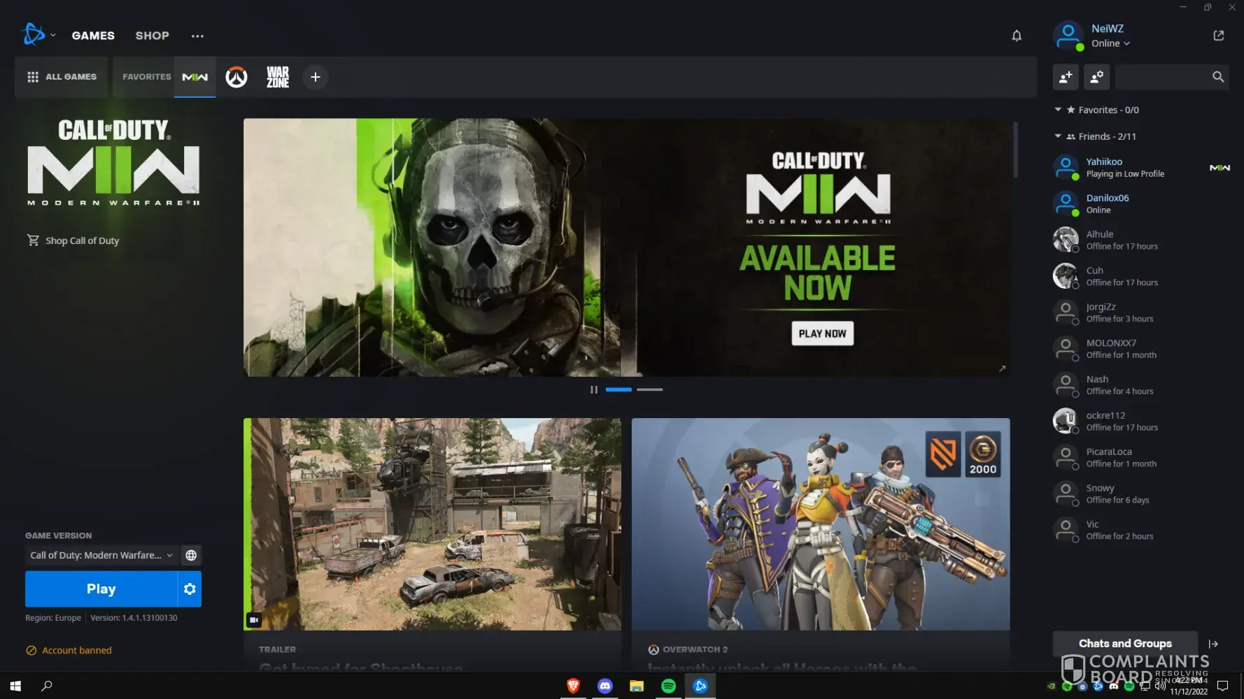 November 16, 2022. I have just downloaded warzone 2.0 on steam and as soon as I launched the game it gave an error saying I am permanently banned and I have yet to even play the game. activision id: xxcallmeumarxx#7379719
