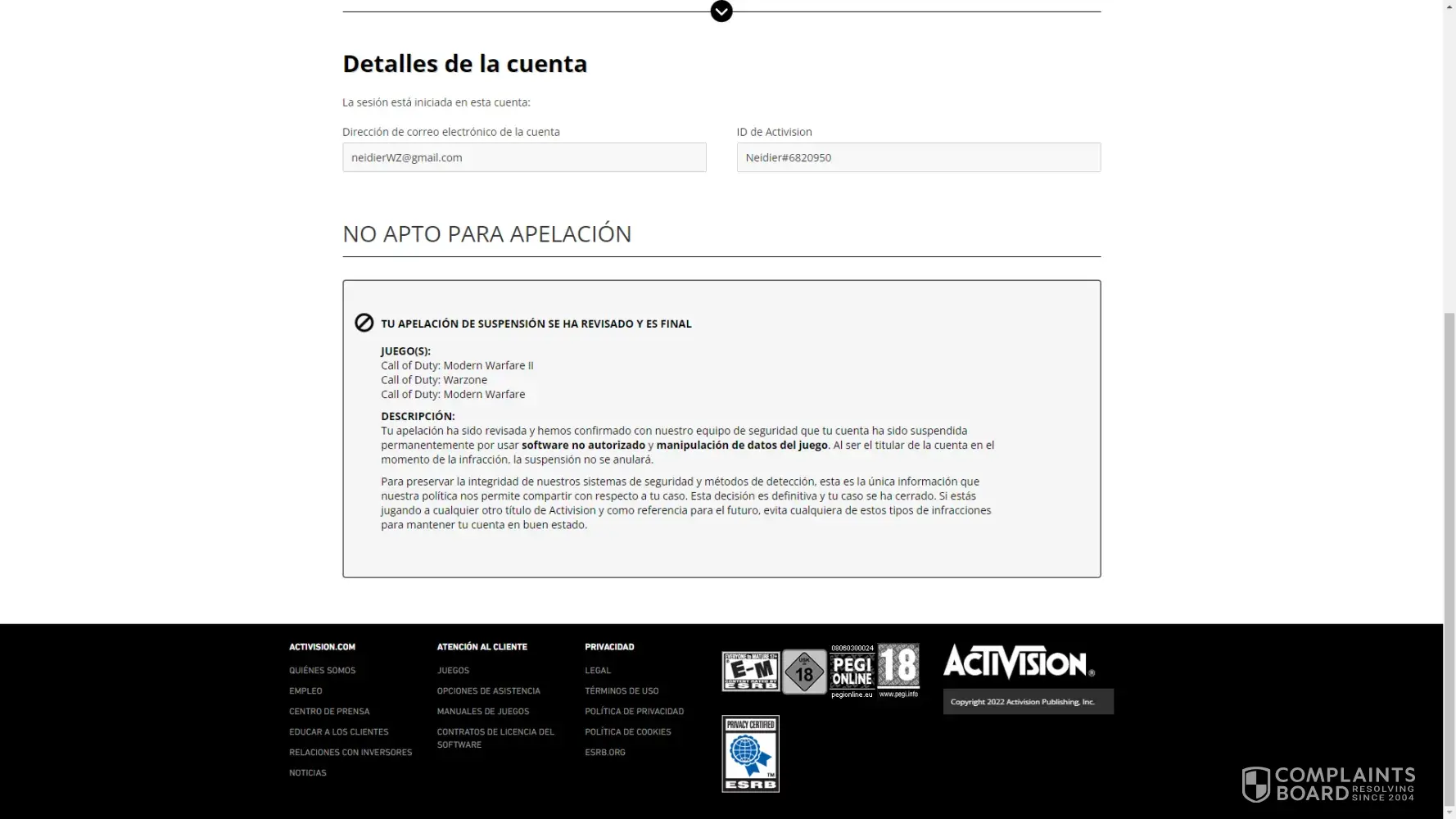 Desired outcome: I would like my account to be unbanned from Modern Warfare 2 (2022), and the game ban to be removed from my account. (Activision ID - nooty#8578990) (Email - [protected]@gmail.com)