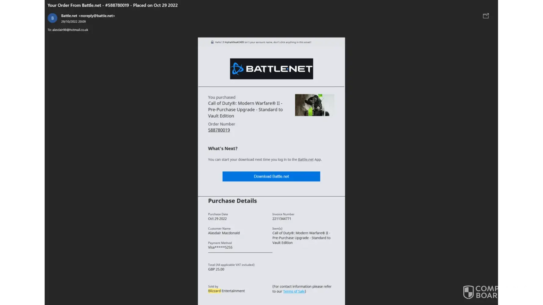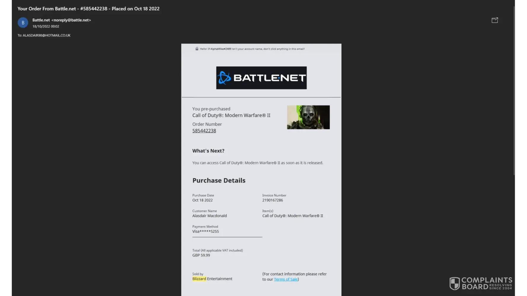 Game purchased on 18th October 2022 - Value £59.99 - Order no. [protected]