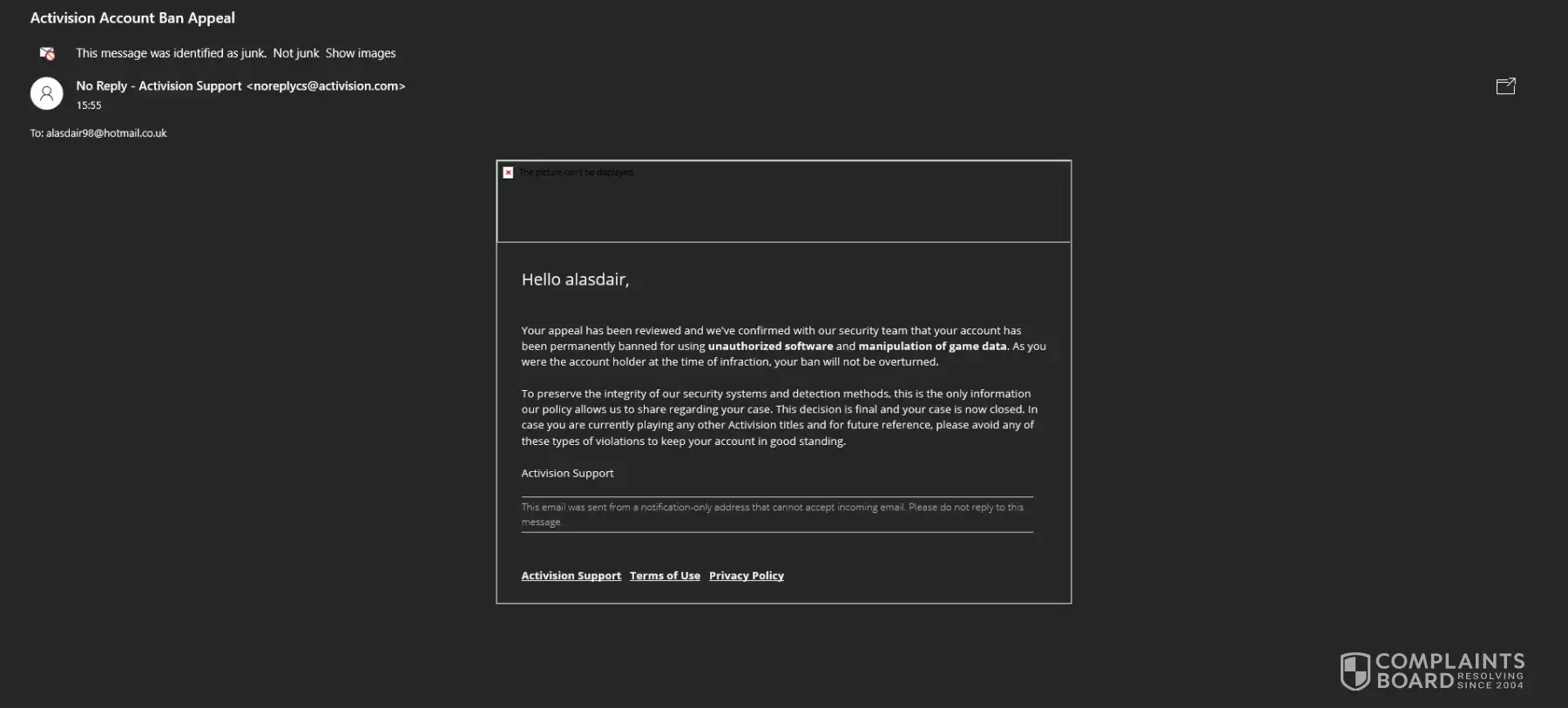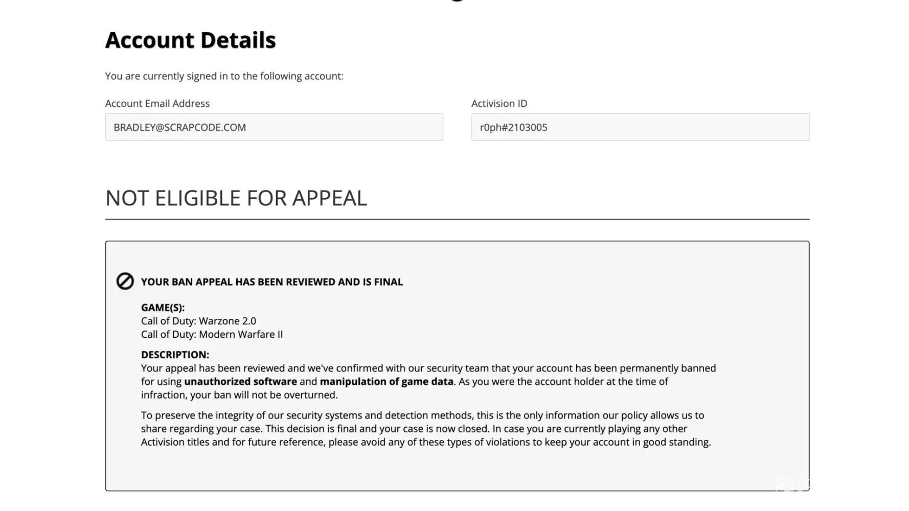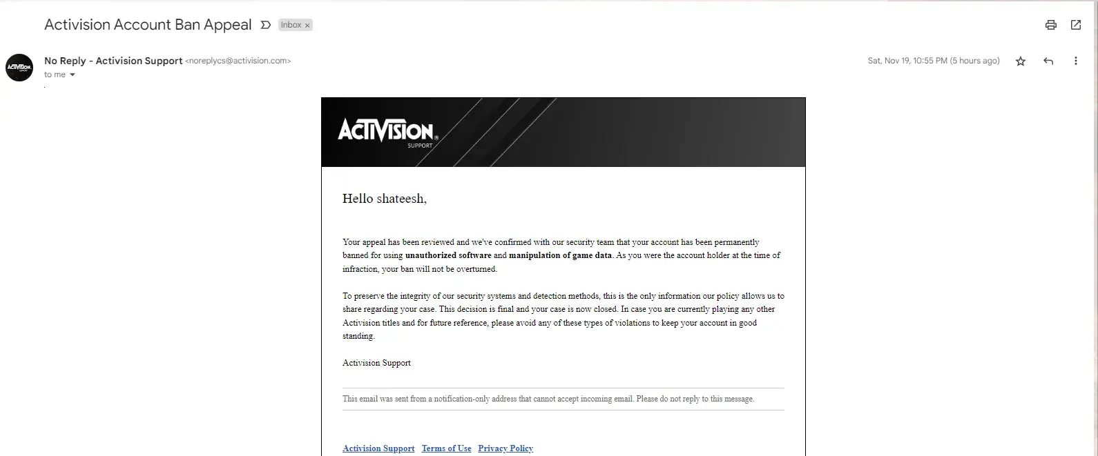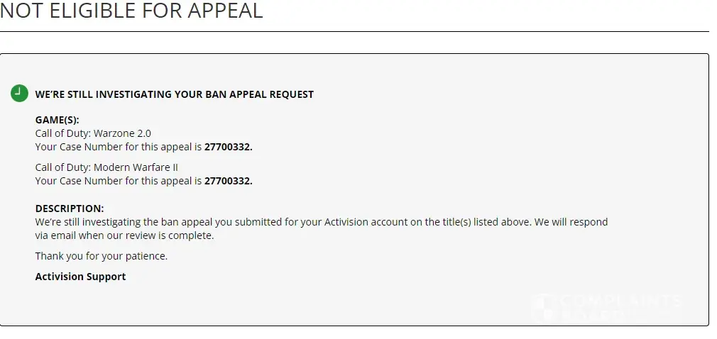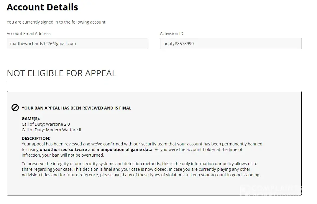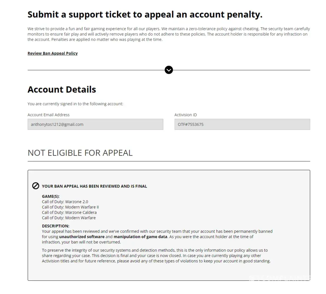 I would like a review of this ban and an actual reason provided as to how this has come about because as it stands I am worried that I will not be able to play any further Activision titles which is one of the few ways I find myself able to unwind with my friends when I am away from work.