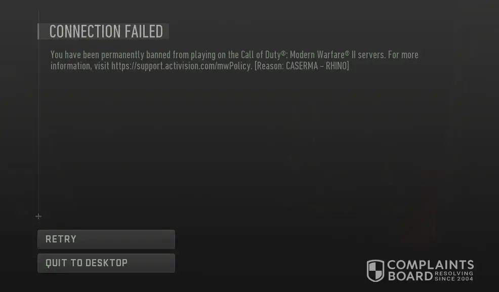 For some reason, I was banned falsely 4 days ago with the code "CASERMA RHINO" now appearing accompanied by a permanent ban message when trying to load mw2 up from steam. I don't get this ban as I spent 120 hours grinding out the game to try and unlock the Orion camos within the game. I literally haven't even thought about cheating on the game. Also for some reason, the ban was applied to the mw2 open beta version of the game and not the main game, not sure why but either way I didn't cheat on the beta or the main game, why would I, there's no reason to. So this ban really came as a shock to me. I tried appealing this ban on the Activision ban appeal support page and I was slapped with the same automated reply that everyone else gets with this same issue. So to sum it up I bought mw2 for £60 and played it for 120 hours relentlessly, just to get banned for something I didn't even do.