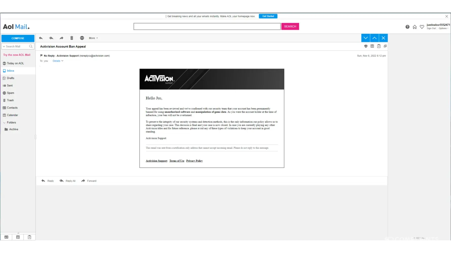 I got permanently banned yesterday for no reason at all i don' have any illegal software on my pc so i thought this was just wrong and it would get overturned by activision. I applied to get unbanned and in 2-3 hours activision replied saying that they won't overturn my ban since their was illegal software on my pc.