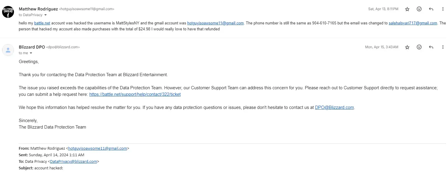 On April 12, 2024 I had noticed suspicious emails and activity regarding my activision account which made me switch my email linked to the account from “[protected]@gmail.com†to “[protected]@gmail.comâ€. Fast forwarding to June 5th 2024, I ran into a hacker/booter on a game mode called “Cutthroat†in ModernWarfare 3. After the hacker/booter lost a game, he decided to boot me off the server and while doing so mocked us in the process. I decide to play later on the night only to noticed I was then banned from the game completely. I tried an appeal but that didn’t work, I have tried contacting activision support but unfortunately didn’t get anywhere. I have tried many account recoveries but it doesn’t seem to get anywhere either. I would just love for my account to be restored and unbanned. On June 13, 2024 I was also ensured a supervisor would contact me regarding this matter within 24-48 hours however they were unable to meet the time frame I was ensured of. This is an unfortunate circumstance that needs to be resolved. On June 13, 2024 again; I started receiving unusual emails regarding my activision account. My account is now under the email “[protected]@gmail.com which IS NOT MINE. I have also filed a new account recovery regarding this entire situation. Activision ID: Tullius#1537115 Account Recovery case number: [protected]